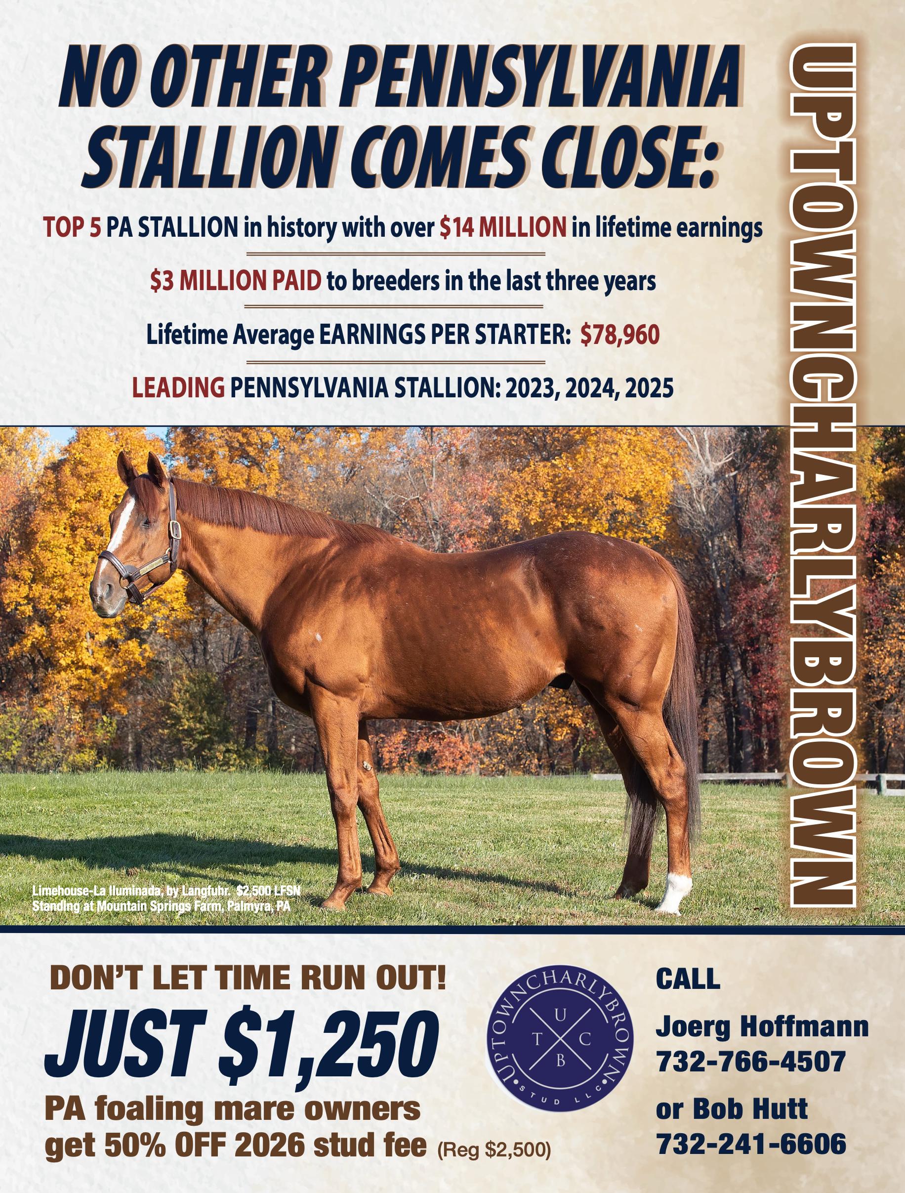 Uptowncharlybrown was only the second stallion in Pennsylvania history to eclipse the $200,000 mark in stallion awards having done so twice in 2023 earning $236,389 when joining the immortal, Jump Start and was Pennsylvania’s leading stallion once again in 2024 earning $225,115. For 2025 at midyear he’s poised to crack the $200,000 barrier for a third consecutive year as he’s already eclipsed the $100,000 barrier. He’s far and away Pennsylvania's leading sire in 2025 stallion awards as he leads all other Pennsylvania stallions by a wide margin.